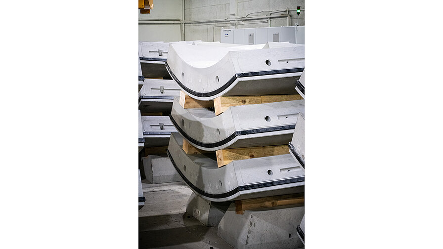 Die Planung und Produktion erfolgte in enger Abstimmung zwischen der Schöck Anwendungstechnik, dem Statikbüro sowie dem MABA Fertigteilwerk. Da die einzelnen Tübbing-Segmente eine leicht unterschiedliche Geometrie haben, musste jeder Stab individuell bemessen und berechnet werden. So unterscheidet sich jeder Kopfbolzen vom anderen in Höhe, Tiefe und Breite. Auch die formgebenden Bügel haben je nach Positionierung im Tübbing jeweils eine um Millimeter andere Länge und einen anderen Biegegrad. Jeder Bügel wiederum hat einen fest definierten Platz im Segment und wurde von Schöck mit dem dafür vorgegebenen, exakten Tübbing-Radius angefertigt. Ziel war, die Anforderungen an die Bewehrung kundenfreundlich und verarbeitungsgerecht umzusetzen. Dazu Fabian Marlok, Leiter Produktmanagement Combar, Isolink, Sconnex und Signo bei Schöck: "Bei Aufträgen wie diesem muss alles individuell angefertigt werden. Und wir haben es in der Produktion mit erhöhten Anforderungen zu tun. Im Gegensatz zu Bewehrungsstahl, der einfach gebogen werden kann und seine Form behält, streben Glasfaserstäbe zurück in die Gerade. Die große Herausforderung für Schöck war, trotz dieser Materialeigenschaften formgebende Bügel zu produzieren, um die Weiterverarbeitung für den Kunden so einfach wie möglich zu machen."