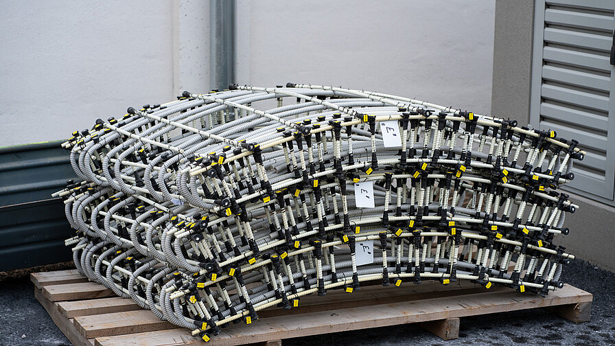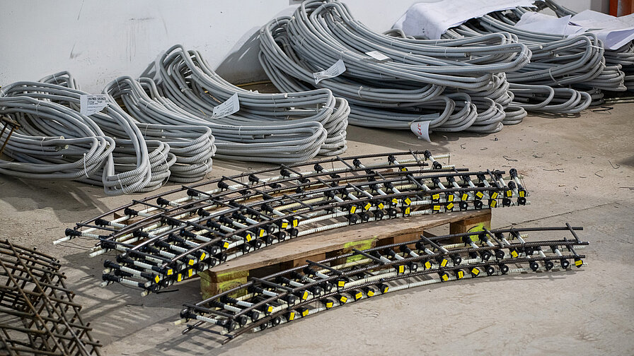 Die fertigen Körbe wurden im weiteren Produktionsverlauf in die Schalungsvorrichtung eingelegt, in die anschließend der Beton eingebracht wurde.
