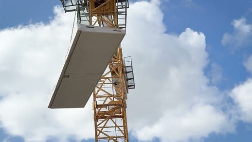 Das Balkonfertigteil wird mittels Kran zum Gebäude gehoben.