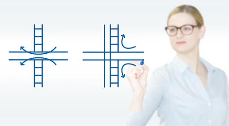 Entkopplung des Treppenlaufs zum Podest durch - Tronsole® Typ F und zur Bodenplatte durch Tronsole® Typ B. Entkopplung des Podests zur Wand durch die Tronsole® Typ P. Der Treppenlauf wird zur Wand mit der Tronsole® Typ L schallgedämmt. Somit ergibt sich die blaue Linie als Qualitätsmerkmal für einen sicheren Trittschallschutz.