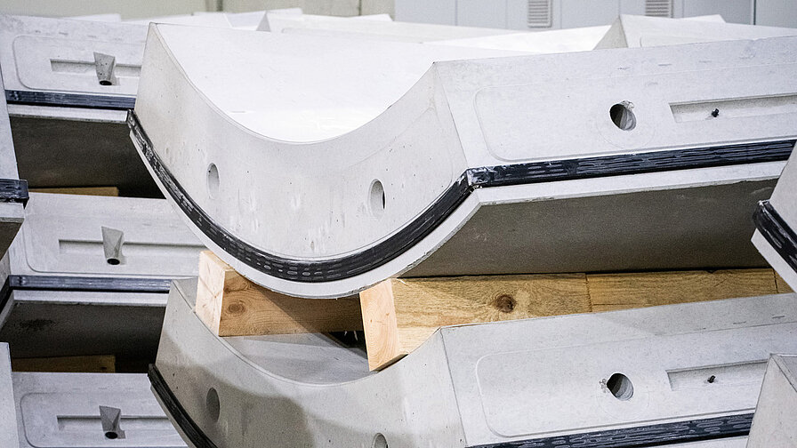 Die Planung und Produktion erfolgte in enger Abstimmung zwischen der Schöck Anwendungstechnik, dem Statikbüro sowie dem MABA Fertigteilwerk. Da die einzelnen Tübbing-Segmente eine leicht unterschiedliche Geometrie haben, musste jeder Stab individuell bemessen und berechnet werden. So unterscheidet sich jeder Kopfbolzen vom anderen in Höhe, Tiefe und Breite. Auch die formgebenden Bügel haben je nach Positionierung im Tübbing jeweils eine um Millimeter andere Länge und einen anderen Biegegrad. Jeder Bügel wiederum hat einen fest definierten Platz im Segment und wurde von Schöck mit dem dafür vorgegebenen, exakten Tübbing-Radius angefertigt. Ziel war, die Anforderungen an die Bewehrung kundenfreundlich und verarbeitungsgerecht umzusetzen. Dazu Fabian Marlok, Leiter Produktmanagement Combar, Isolink, Sconnex und Signo bei Schöck: “Bei Aufträgen wie diesem muss alles individuell angefertigt werden. Und wir haben es in der Produktion mit erhöhten Anforderungen zu tun. Im Gegensatz zu Bewehrungsstahl, der einfach gebogen werden kann und seine Form behält, streben Glasfaserstäbe zurück in die Gerade. Die große Herausforderung für Schöck war, trotz dieser Materialeigenschaften formgebende Bügel zu produzieren, um die Weiterverarbeitung für den Kunden so einfach wie möglich zu machen.”