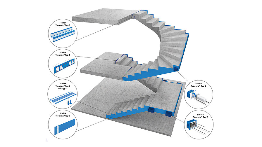Der Nachweis des Schallschutzes für die Schöck Tronsole® erfolgte in einem Prüfstand für Massivtreppen und wurde nach dem neuen Verfahren gemäß DIN 7396 „Bauakustische Prüfung – Prüfverfahren zur akustischen Kennzeichnung von Entkopplungselementen für Massivtreppen“ geprüft. Für alle Produkte wurde die Treppentrittschallminderung auch unter Last geprüft, damit der Planer sichere Eingangswerte für den Nachweis des Schallschutzes hat. Um einen guten Trittschallschutz sicherzustellen, müssen alle Komponenten und Anschlüsse im Treppenhaus berücksichtigt werden. Die gesamtheitliche Lösung der Schöck Tronsole® bietet die Möglichkeit, sowohl Fertigteil- als auch Ortbetontreppen, gerade oder gewendelte Treppenläufe sowie Treppenpodeste schalltechnisch in den Griff zu bekommen.