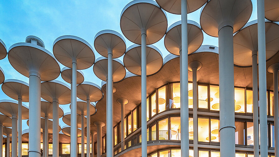 Jede Etage ziert eine Gesimsverblendung aus Weißbeton auf einer Gesamtlänge von einem Kilometer. Die einzelnen Elemente der Gesimsbänder sind mit einem tragenden Wärmedämmelement für auskragende Bauteile, dem Schöck Isokorb, an die Geschossdecken angeschlossen. „Der 21 Meter hohe vertikale Säulenwald lehnt sich horizontal an das Gebäude an, dadurch konnten die Geschossdecken nicht wirklich auskragen. Sie erscheinen durch ihre Betonfarbigkeit so, als würden sie von außen nach innen und umgekehrt durchlaufen“, beschreibt Heidrun Schuhmann die optische Wirkung.