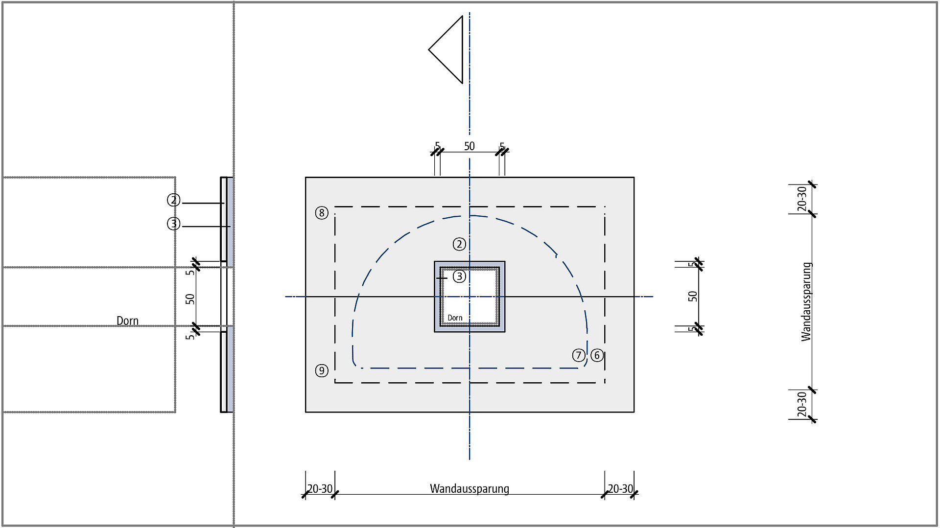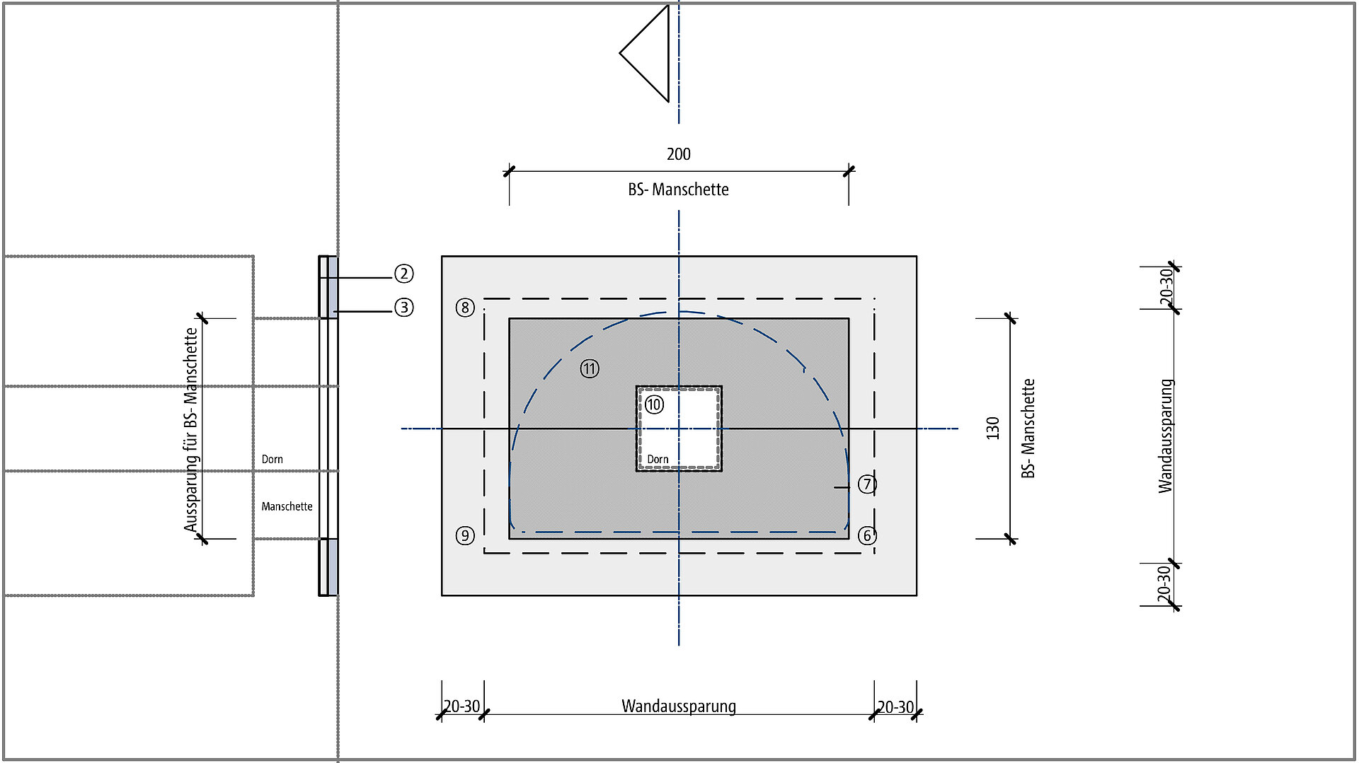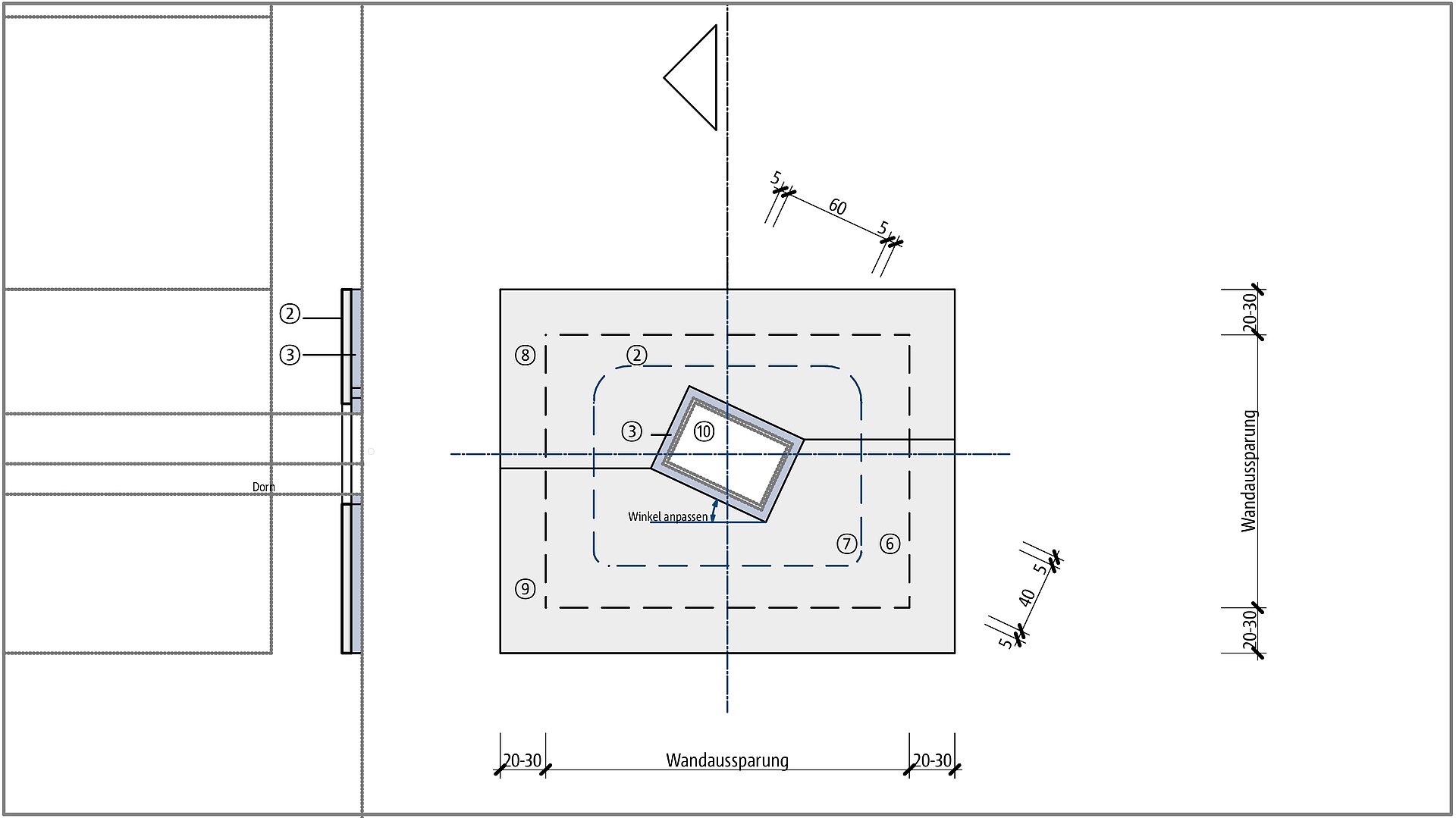 - Dabei ist bei der Gestaltung und Anbringung der Verkleidung der Wandaussparung auf eine schallbrückenfreie Ausführung zu achten. Dies kann durch eine elastische Fuge zum Tragelement sowie durch einen Dämmstoff zur Wandaussparung gewährleistet werden.