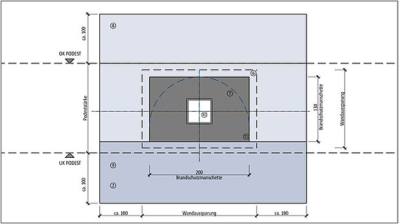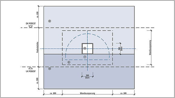 - Wie eine Verkleidung der Wandaussparung aussehen und der Einsatz im Treppenhaus erfolgen kann, ist den nachfolgenden Zeichnungen beispielhaft zu entnehmen.