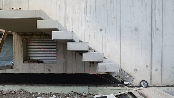 - In nachfolgenden Abbildungen sind die bereits montierten Einzelstufen, die zugehörigen Einbauteile für die Stahlbetonwand sowie die Fertigteilstufen mit bereits integrierten Einbauteilen abgebildet.