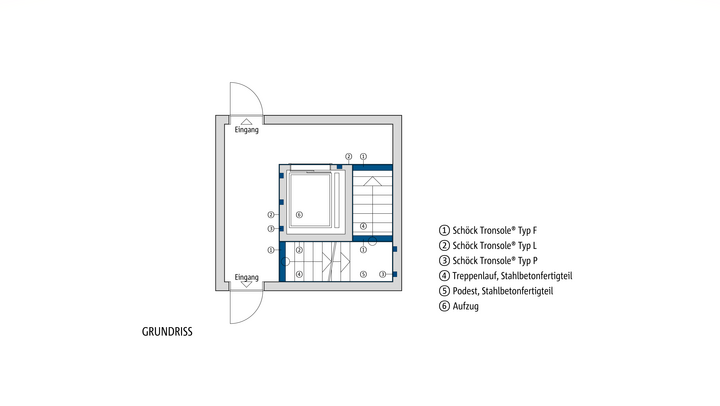 - Zur akustischen Entkopplung von Aufzugsschächten und Decken bzw. von Aufzugsschächten und Treppenläufen /-podesten kann die Schöck Tronsole® Typ P eingesetzt werden.