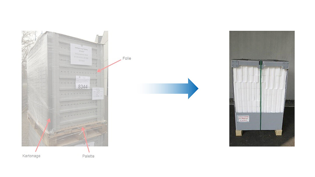 • Dadurch konnte PE-Folie eingespart und die Frachtstrecke um ca. 14 % minimiert werden.