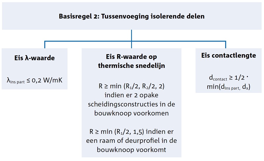 Deze basisregel is van toepassing op bouwknopen waarbij de isolatielagen niet op elkaar kunnen aansluiten. Hier kan gebruik gemaakt worden van een tussengevoegd isolerend deel. Dit isolerende deel neemt plaatselijk de functie van thermische isolatie over. Hierdoor kan de thermische snede behouden blijven.
