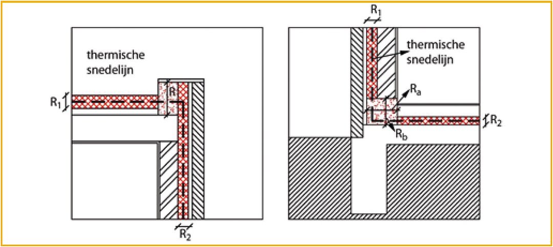 - De R-waarde loodrecht op de thermische snedelijn (zie figuur 2) moet minimaal gelijk zijn aan de helft van de R-waarde van de isolatie van de samenkomende scheidingsconstructie en moet minimaal 2 zijn (of 1,5 bij aansluiting op het schrijnwerk);