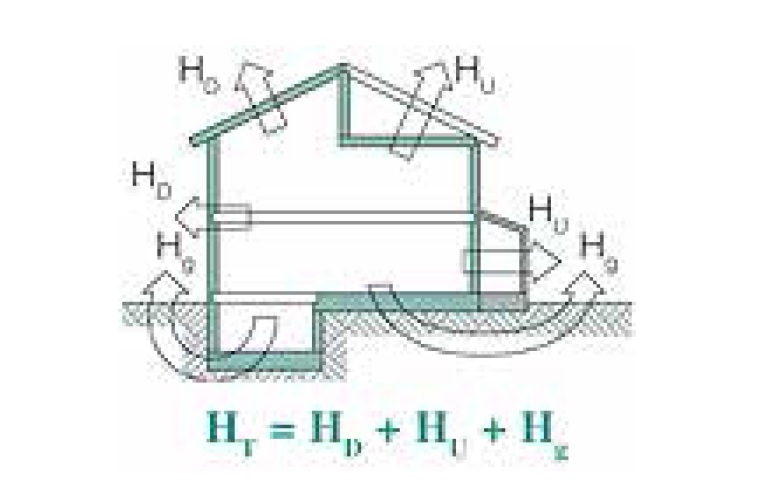 - HA : het warmteverlies via een aangrenzende verwarmde ruimte (gelijkgesteld aan 0 W/K)