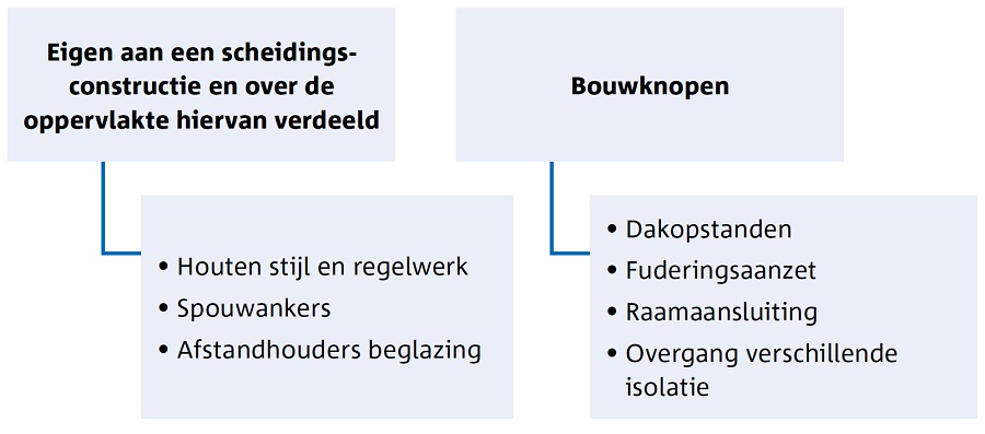 De twee- en driedimensionale transmissieverliezen kunnen onderverdeeld worden in twee groepen. Enerzijds zijn er de bouwknopen die afzonderlijk worden ingerekend als K-peil toeslag, anderzijds zijn er de lineaire en puntvormige onderbrekingen eigen aan een scheidingsconstructie. Deze worden in rekening gebracht in de U-waarde van het desbetreffende bouwdeel.