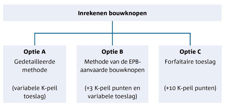 In de EPB zijn er drie mogelijkheden voor het ingeven van bouwknopen, elk met hun eigen impact. Bij de keuze van optie A moeten alle bouwknopen gedetailleerd ingegeven worden, in optie B wordt gebruik gemaakt van een vereenvoudigde methode van EPB-aanvaarde bouwknopen en in optie C wordt rekening gehouden met een forfaitaire toeslag.