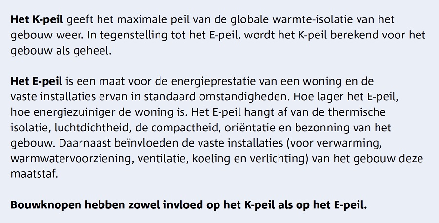 Sinds 1 januari 2006 moeten alle gebouwen met een aanvraag om te bouwen of te verbouwen voldoen aan de EPB-regelgeving of voluit: "Energieprestatie en Binnenklimaat regelgeving". Hiervoor moet er voldaan worden aan verschillende eisen inzake isolatie (K-peil), energie (E-peil) en ventilatie. Voor sommige gebouwen zoals zwembaden, ziekenhuizen, industrie, etc. is er geen E-peil eis. Indien men niet aan deze eisen voldoet worden er boetes opgelegd die het meervoudige kunnen zijn van de investering die nodig is om de opgelegde eisen te halen.