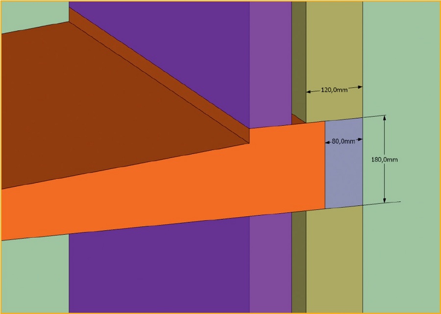 Indien we deze bouwknoop in detail uitrekenen verkrijgen we een resultaat van Ψ = 0,15 W/m²K. Deze waarde is groter dan de Ψe,lim = 0,10 W/m²K. Deze bouwknoop is evenwel niet EPB-aanvaard. Toch is de effectieve Ψ-waarde kleiner dan de waarde bij ontstentenis Ψwbo (of default waarde Ψdef). Deze Ψwbo bedraagt 0,50 W/m²K bij lineaire bouwknopen (in geval van thermische onderbrekingen).