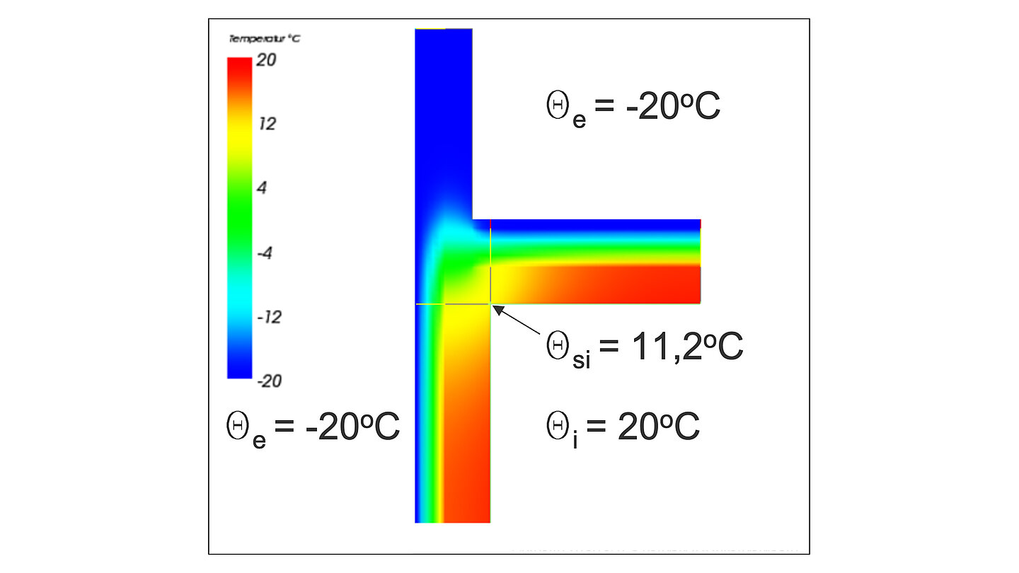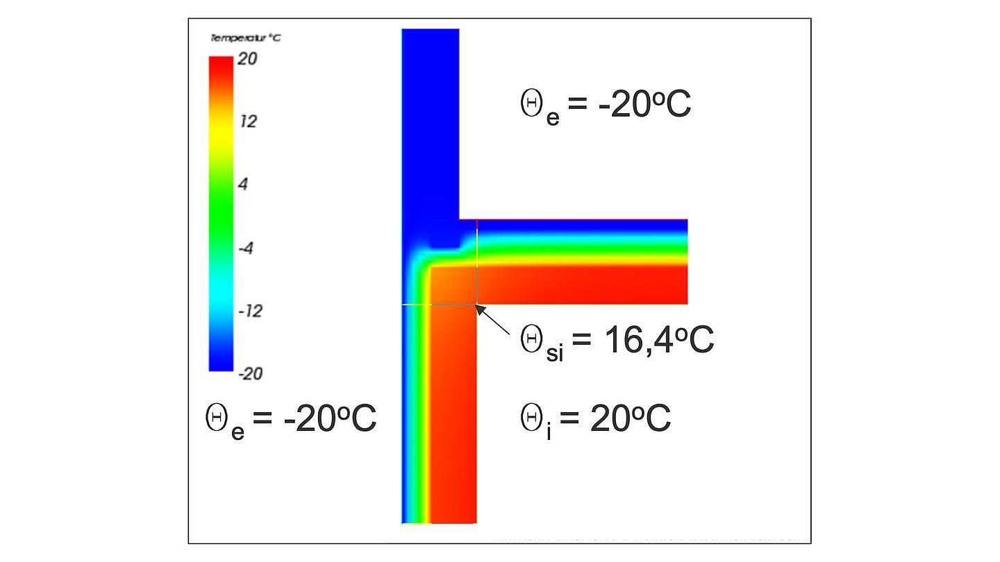 Żelbetowa balustrada tarasu z mostkiem cieplnym – rozkład temperatur. Wyraźnie widoczne obniżenie temperatury w narożniku wewnętrznej powierzchni ściany i sufitu z powodu kumulacji geometrycznego (narożnik zewnętrzny) i materiałowego (nieodizolowana konstrukcja balustrady od stropu) mostka cieplnego. Istnieje duże ryzyko powstania zagrzybienia wskutek kondensacji pary wodnej na wychłodzonej wewnętrznej powierzchni przegrody.