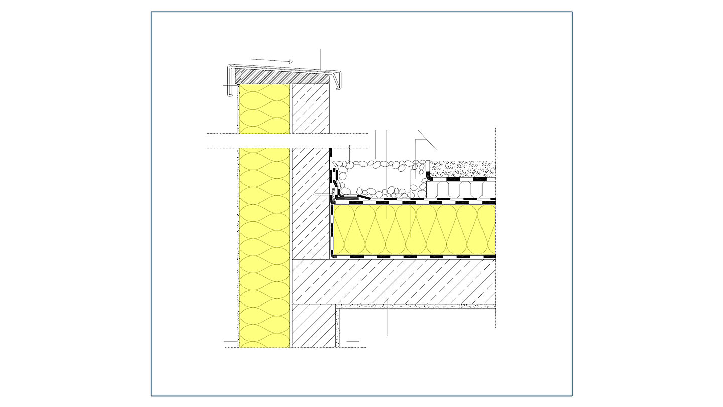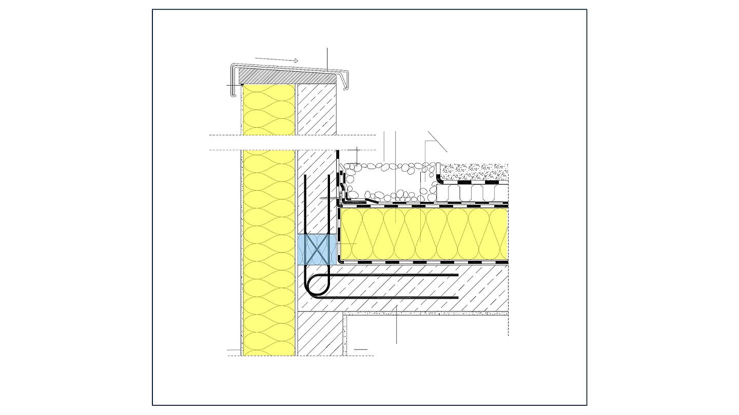 Łącznik termoizolacyjny wbudowany pomiędzy pionową żelbetową balustradą tarasu a stropodachem tworzy ciągłą izolację zewnętrzną skutecznie eliminując bardzo duży mostek cieplny. Efektem takiego rozwiązania jest bardzo duże ograniczenie strat ciepła oraz wyeliminowanie ryzyka zagrzybienia.