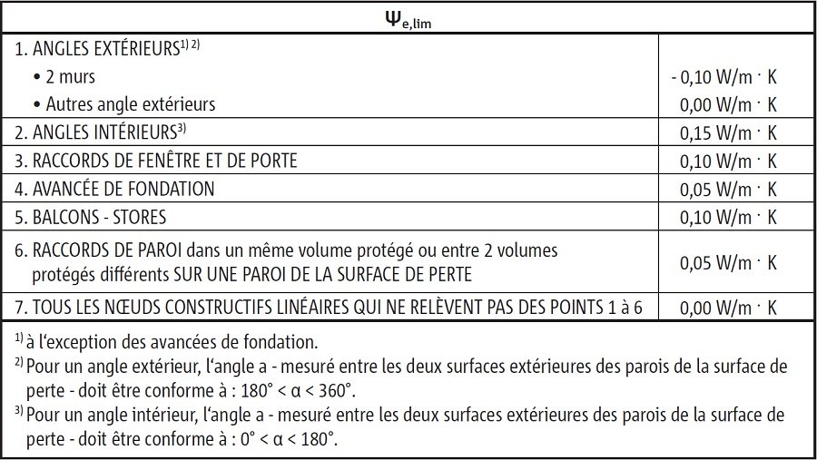 Si les règles de base ne sont pas respectées, cela ne signifie pas que le noeud constructif n'est pas un noeud constructif accepté PEB. S'il est démontré via des calculs numériques validés que Ψe ≤ Ψe,lim, le noeud constructif est également accepté PEB. Les valeurs limites pour le coefficient de transition thermique linéaire (Ψe,lim) sont définies par type de noeud de construction.