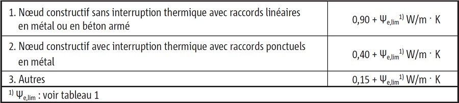 Si la détermination d'une valeur Ψe pour un certain noeud constructif est trop complexe et qu'un calcul numérique validé ne vaut pas la peine (car le noeud constructif n'apparaît que sur une longueur limitée), on peut utiliser la valeur par défaut. Cette valeur a une influence négative. L'application multiple de cette méthode conduit à un ajout important de points aux niveaux K et E.